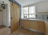 Aan de voorzijde vind je een luxe, handgemaakte eikenhouten keuken met alles wat je nodig hebt: een 4-pits inductiekookplaat, rvs-afzuigkap, koelkast, combi-oven en een vaatwasser.