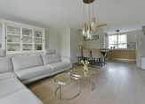 De woonkamer is gericht op de tuin en dankzij de grote ramen valt er heerlijk veel daglicht naar binnen. Onder de trap zit een handige trapkast – ideaal voor extra bergruimte. Via een deur loop je zó de tuin in.