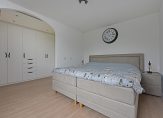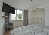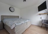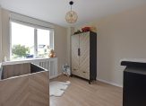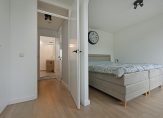 De slaapkamer aan de achterzijde is voorzien van een royale, op maat gemaakte kastenwand. De badkamer ligt aan de voorzijde en is uitgerust met een inloopdouche, tweede toilet en een stijlvol wastafelmeubel – helemaal van nu. De rest van de badkamer is strak afgewerkt met gestucte wanden en een gestuct plafond.