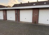 Garage gelegen in Nieuwkoop met stalen kanteldeur gelegen in een rij van garages aan een plein, voorzien van een plat dak met bitumen dakbedekking.