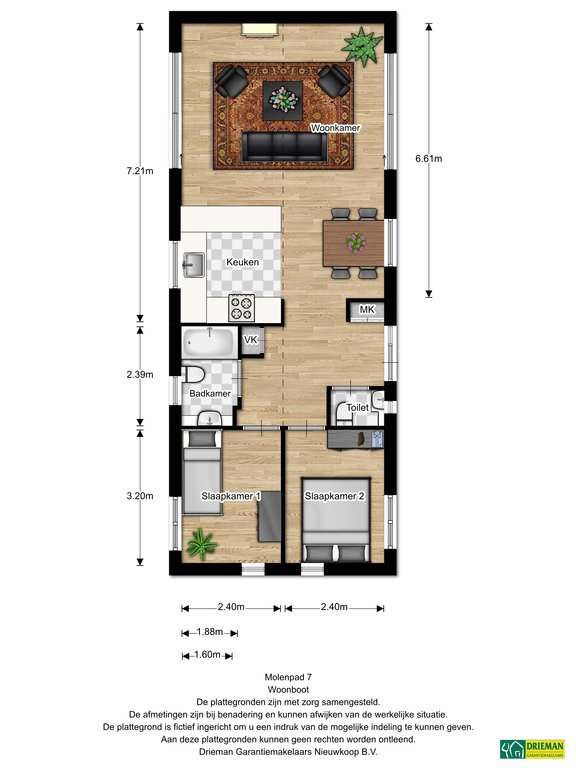 Onze koopakte volgt de standaard NVM-regels. De waarborgsom/bankgarantie bedraagt minimaal 10% van de koopsom. Deze projectinformatie vormt geen aanbieding of offerte en is onder voorbehoud van goedkeuring door de verkoper. Wij aanvaarden geen aansprakelijkheid voor de samengestelde gegevens. Deze informatie, gesprekken en onderhandelingen zijn vrijblijvend. Overeenstemming is pas bereikt wanneer de door Drieman Garantiemakelaars Nieuwkoop opgestelde koopovereenkomst door beide partijen is beoordeeld en ondertekend. Tot dat moment behouden beide partijen het recht om af te zien van een transactie, zonder kostenvergoeding, etc. Alle vermelde maten zijn indicatief en hieraan kunnen geen rechten worden ontleend.