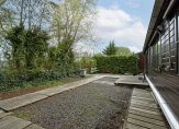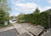 Aan de achterzijde van de ark heb je uitzicht op de plas en een smalle houten plankensteiger. Aan de voorzijde bevindt zich een ruime, omheinde tuin die momenteel onderhoudsvriendelijk is ingericht met grind en steenschotten. In de voortuin staat een kleine houten berging, ideaal voor het opbergen van tuingereedschap en tuinmeubels.