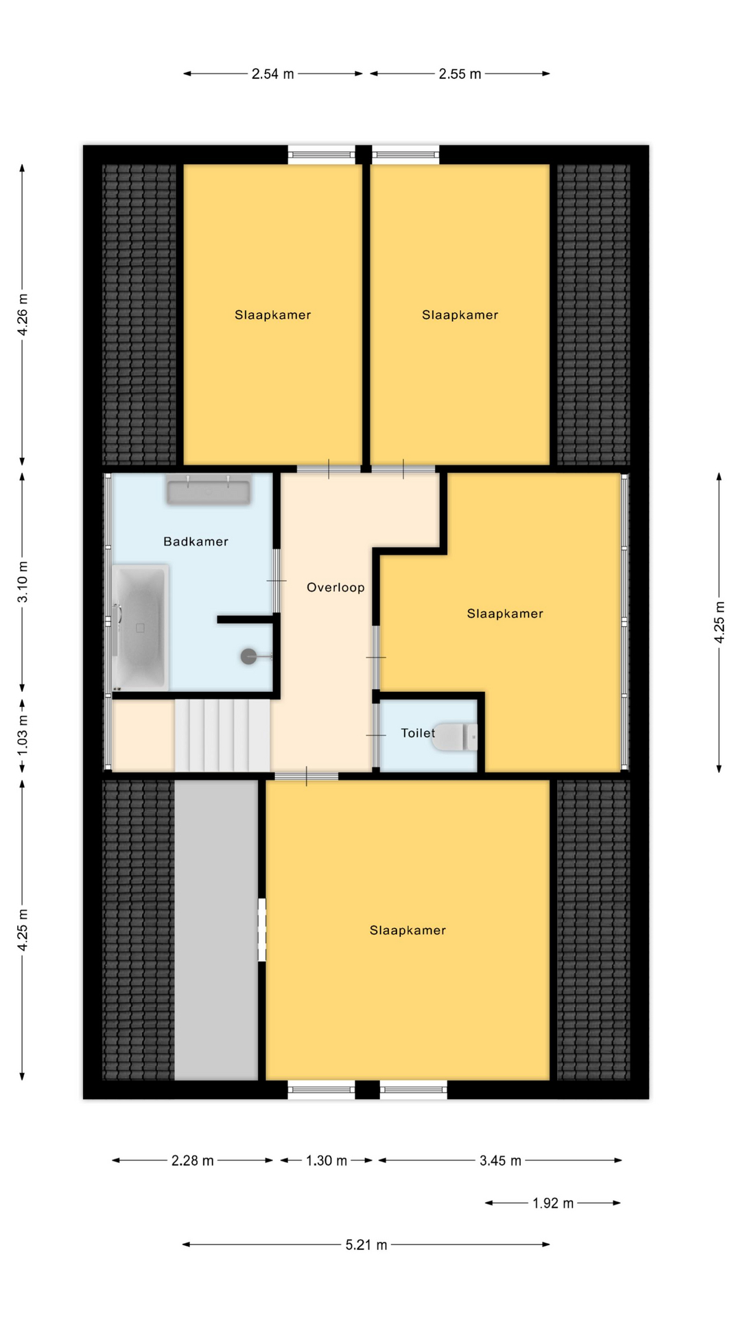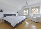 Slaapkamer met dakkapel voorzien van elektrische rolluiken. Moderne badkamer met ligbad, dubbele wastafel en inloopdouche. Aan de achterzijde bevinden zich nog twee slaapkamers.