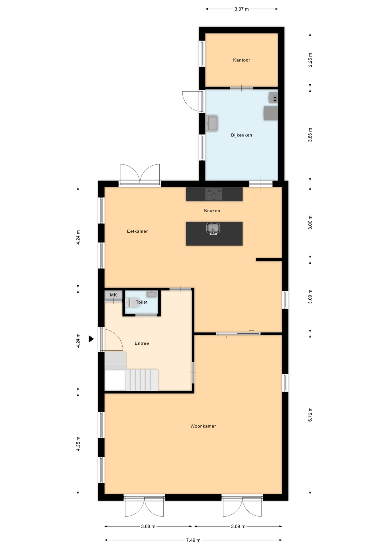 • Aanbouw met ruime bijkeuken en zolder met de mogelijkheid tot slaapkamer (nu in gebruik als kantoor).