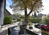 Aan de voorzijde vindt u een tweede tuin, met een uitnodigend zonneterras, klassieke markiezen die sfeer en schaduw brengen, en een prachtige lommerrijke kastanjeboom die ‘s zomers voor een natuurlijke verkoeling zorgt.