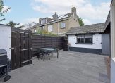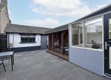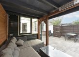 De achtertuin ligt op het noorden, maar dankzij de overkapping kun je hier het hele jaar door genieten. Achterin de tuin bevindt zich een grote stenen berging met elektra én een handige achterom.