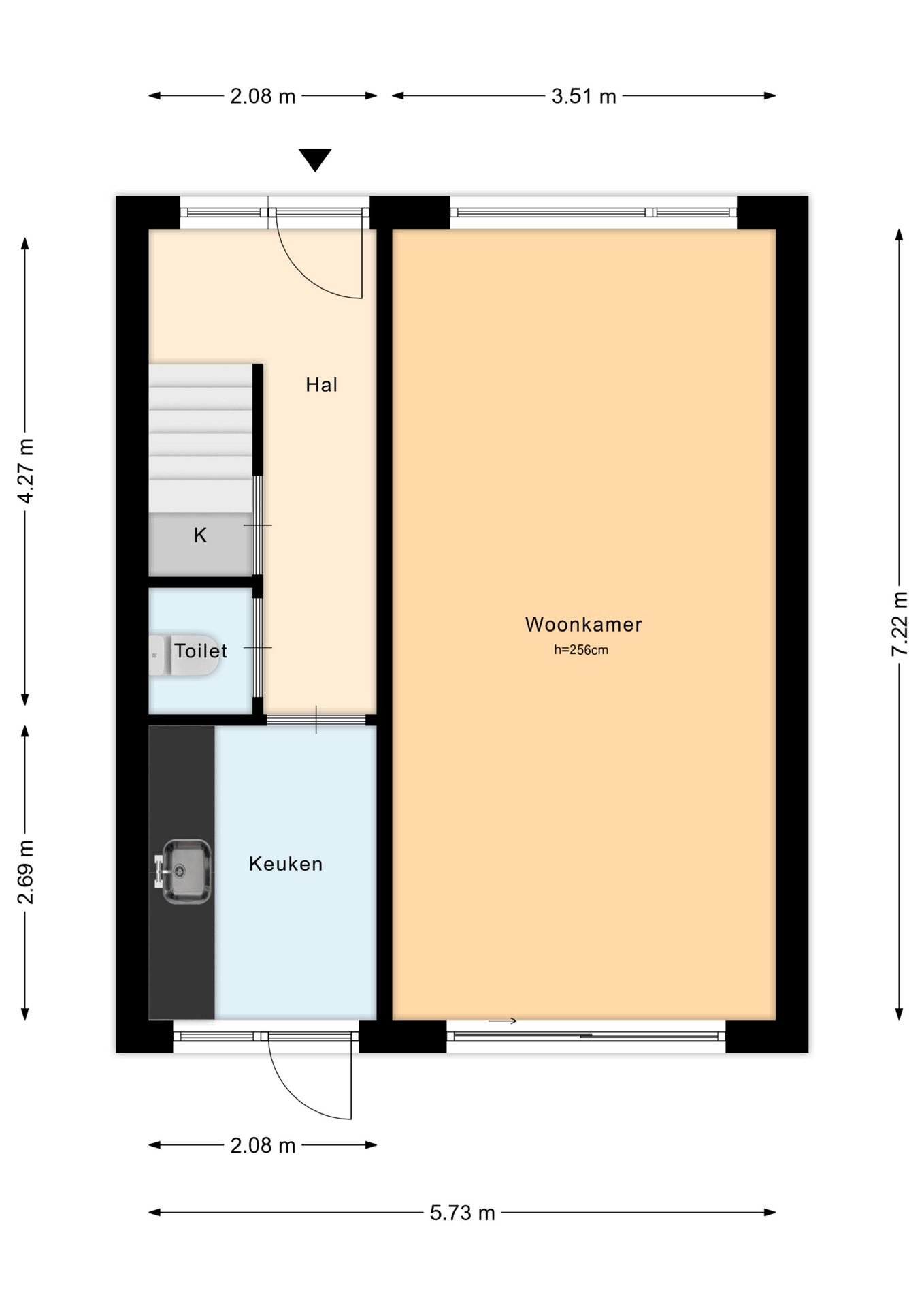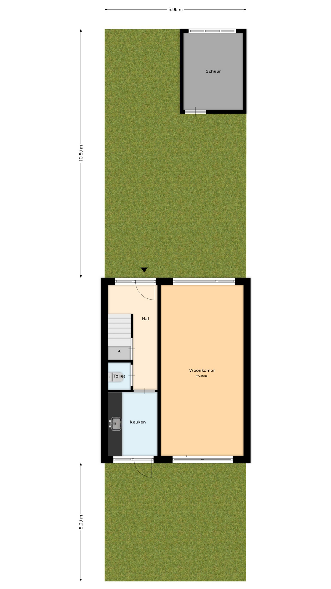 Entree/hal met meterkast, trapkast, toiletruimte, trapopgang en toegang tot de woonkamer. De doorzonwoonkamer heeft grote raampartijen en schuifpui naar de tuin waardoor er veel licht binnenkomt. Aan de achterzijde bevindt zich de dichte, eenvoudige keuken met doorgang naar de tuin. De achtertuin (circa 10 meter diep) ligt op het zuidoosten en beschikt over een vrijstaande stenen berging met elektra.