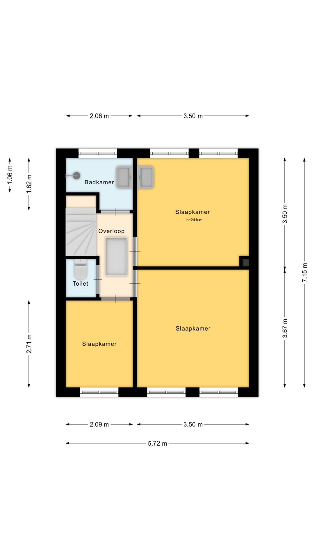 Overloop met toegang tot drie slaapkamers en de badkamer. De slaapkamers hebben goede afmetingen, respectievelijk ca. 13, 12 en 6 m². De badkamer is eenvoudig en biedt mogelijkheden voor renovatie.