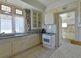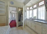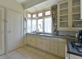 Aan de zijkant van de woning bevindt zich de keuken, die toegang biedt tot de bijkeuken en de kelderkast. De keuken is sinds de bouw van de woning in gebruik, maar door de jaren heen aangepast en voorzien van moderne apparatuur. Het authentieke karakter is prachtig behouden, met details zoals glas-in-loodramen en een stijlvol granieten keukenblad.