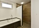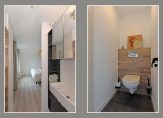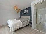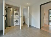 De ruime badkamer, geplaatst in 2018, beschikt over een ligbad, inloopdouche en een dubbel wastafelmeubel. Ook zijn er een keurig weggewerkte wasruimte en een separaat toilet met hangend closet en fonteintje aanwezig.