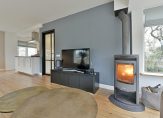De lichte woonkamer aan de voorzijde heeft een charmante erker met grote raampartijen en biedt uitzicht op de brug en het Aarkanaal. De woonkamer heeft een prachtige grenen vloer en er is een rookkanaal met speksteenkachel (gaat mee).