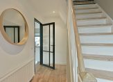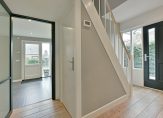 De entree bevindt zich aan de zijgevel en biedt toegang tot de hal met trapopgang, vernieuwde meterkast (2021), en doorgang naar de woonkamer, kelder en uitbouw.