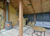 Achter in de tuin staat een fraaie houten berging met een overkapping, voorzien van glazen panelen en een houtkachel. Dit is de perfecte plek om te genieten van het uitzicht op spelende kinderen.