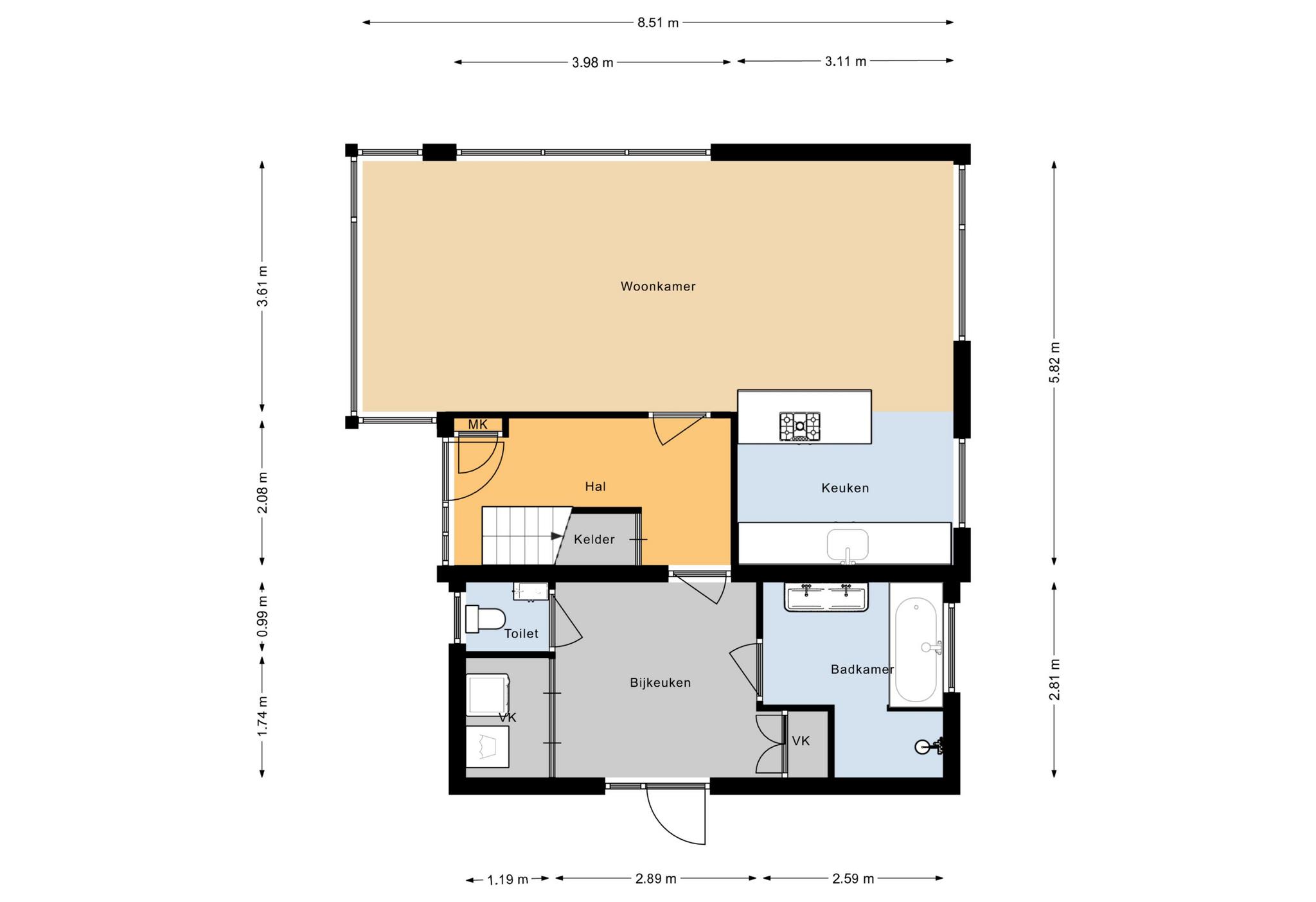 In de hal bevindt zich een deur naar de kelder met stahoogte, ideaal voor opslag van proviand.