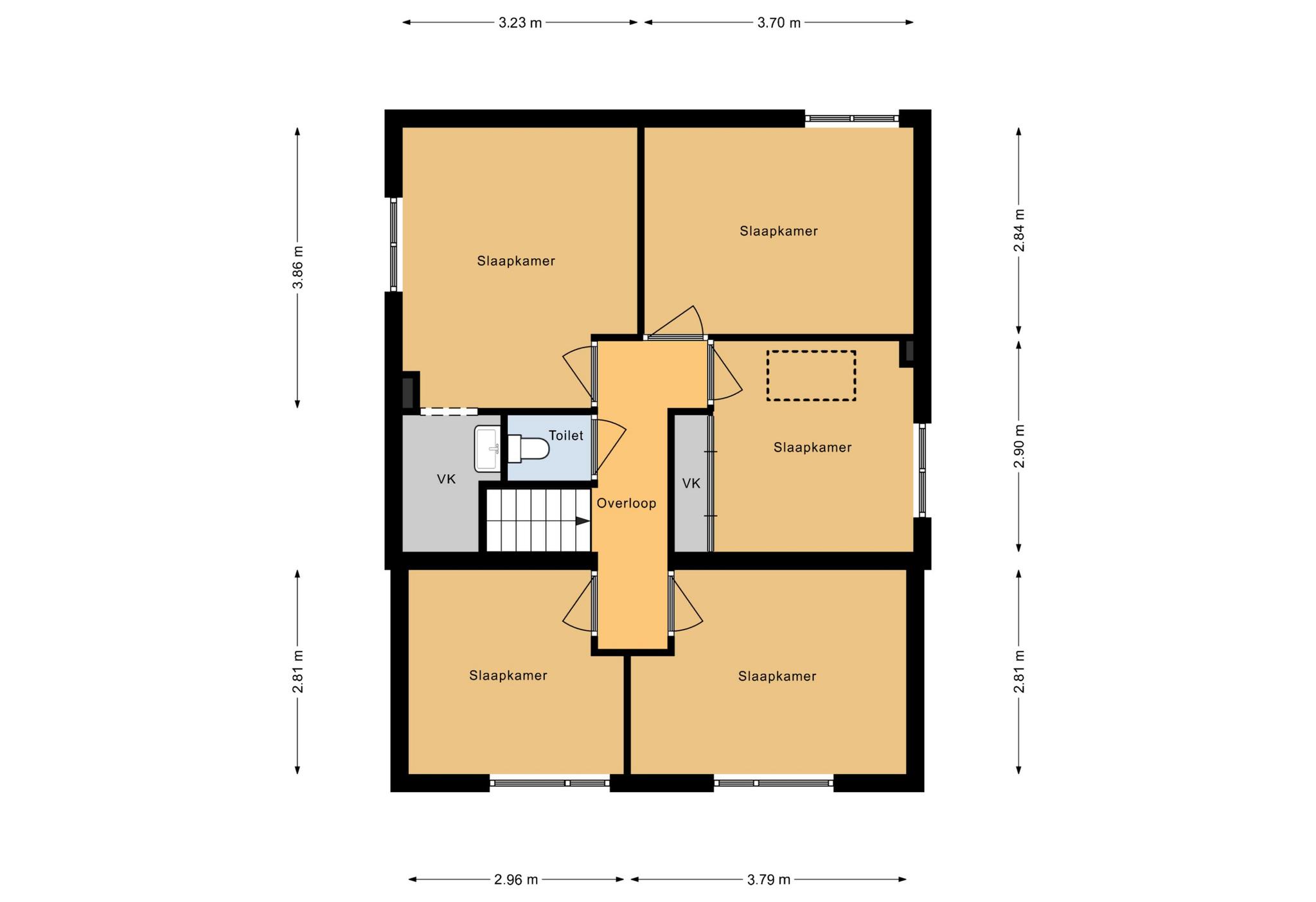 Via de trapopgang bereikt u de overloop met links drie slaapkamers (waarvan één in gebruik als kantoor) en een separaat toilet. Aan de rechterzijde bevinden zich nog twee slaapkamers in de opbouw.