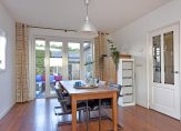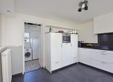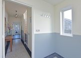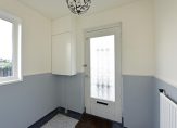De bijkeuken, grenzend aan de keuken, biedt ruimte voor de cv-ketel, wasmachine, droger en een bergvliering. Daarnaast geeft een loopdeur toegang tot de tuin.