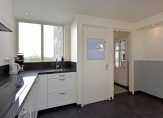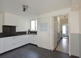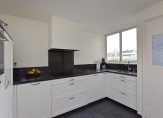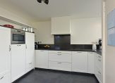 De vergrote keuken bevindt zich aan de achterzijde en is ingericht in een hoekopstelling. De keuken is voorzien van diverse inbouwapparatuur, zoals een 5-pits keramische kookplaat, afzuigkap, koelkast, vaatwasmachine en combimagnetron. Een fraaie tegelvloer met vloerverwarming maakt het geheel compleet. Vanuit de keuken is de praktische, diepe kelderkast voor extra voorraadruimte, te bereiken.