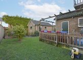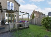 De achtertuin is gelegen op het noorden en meet circa 7 meter diep en 13 meter breed. De tuin is verzorgd aangelegd met een terras van sierbestrating, gazon, plantenborders en een schutting. Achter in de tuin staat een ruime stenen berging met vliering en elektra. Schuin voor de woning is een parkeerplaats voor meerdere auto’s op eigen terrein gecreëerd.