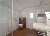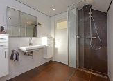 De moderne badkamer is voorzien van een inloopdouche met thermostaatkraan, een wastafel met kast en spiegel, een vrijhangend toilet, een designradiator en comfortabele vloerverwarming.